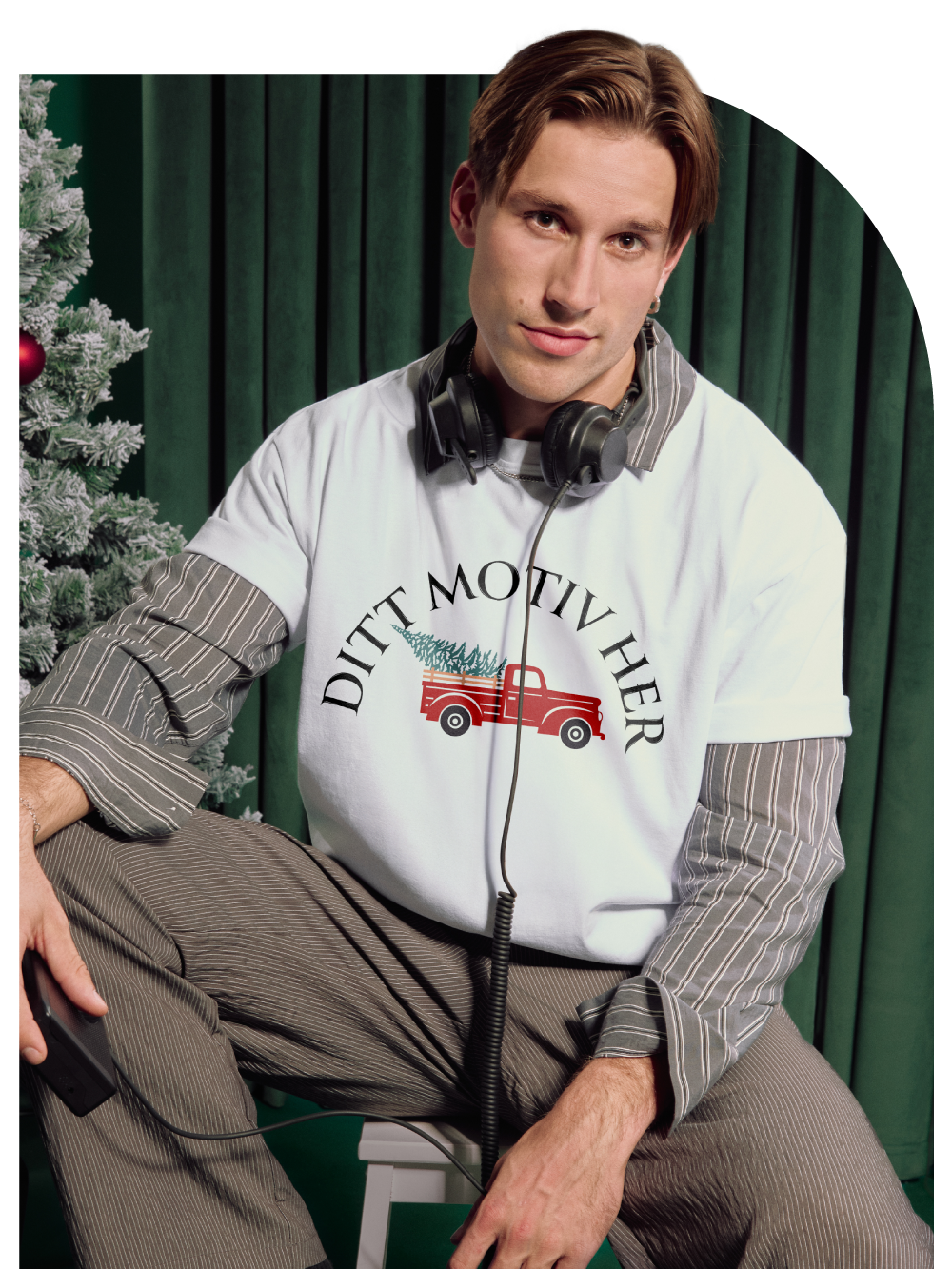 Finn motivet du vil ha og velg blant 250 forskjellige produkter, som vi så trykker eller broderer slik du vil ha dem.